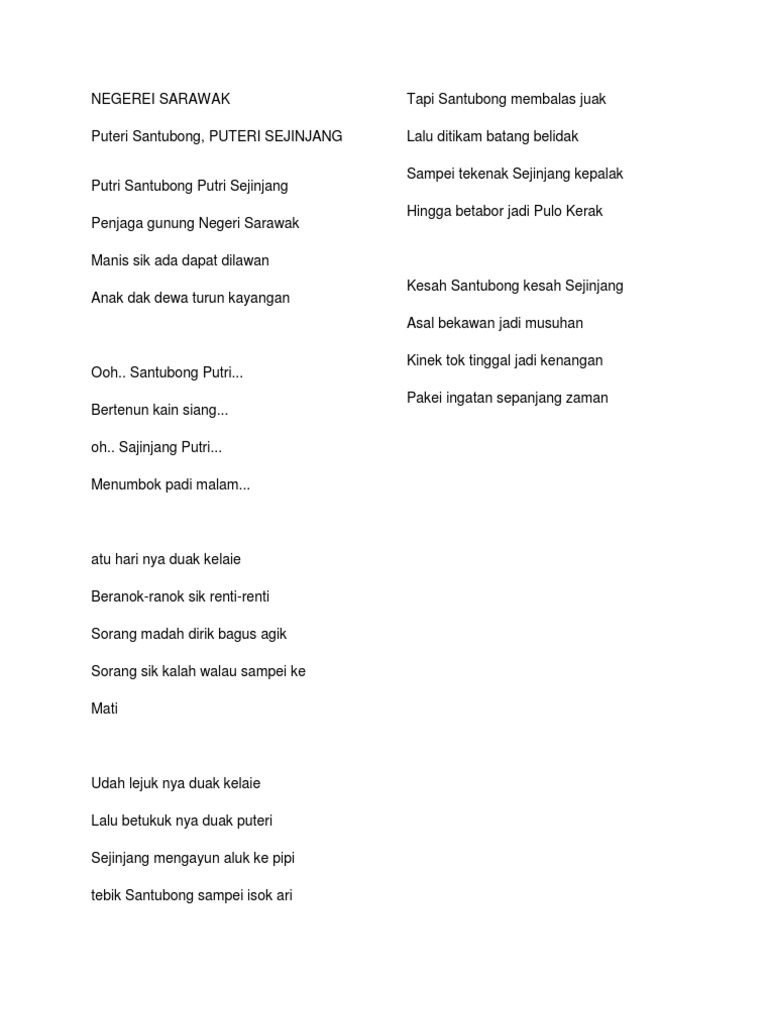 Lirik Lagu Puteri Santubong Puteri Sejinjang